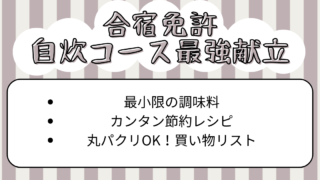 自動車免許の合宿で自炊コースを選ぶ人向け。2週間を乗り切る最強献立を、調味料最小限・節約・簡単を重視して紹介。買い物リスト付きで、真似するだけでOK。