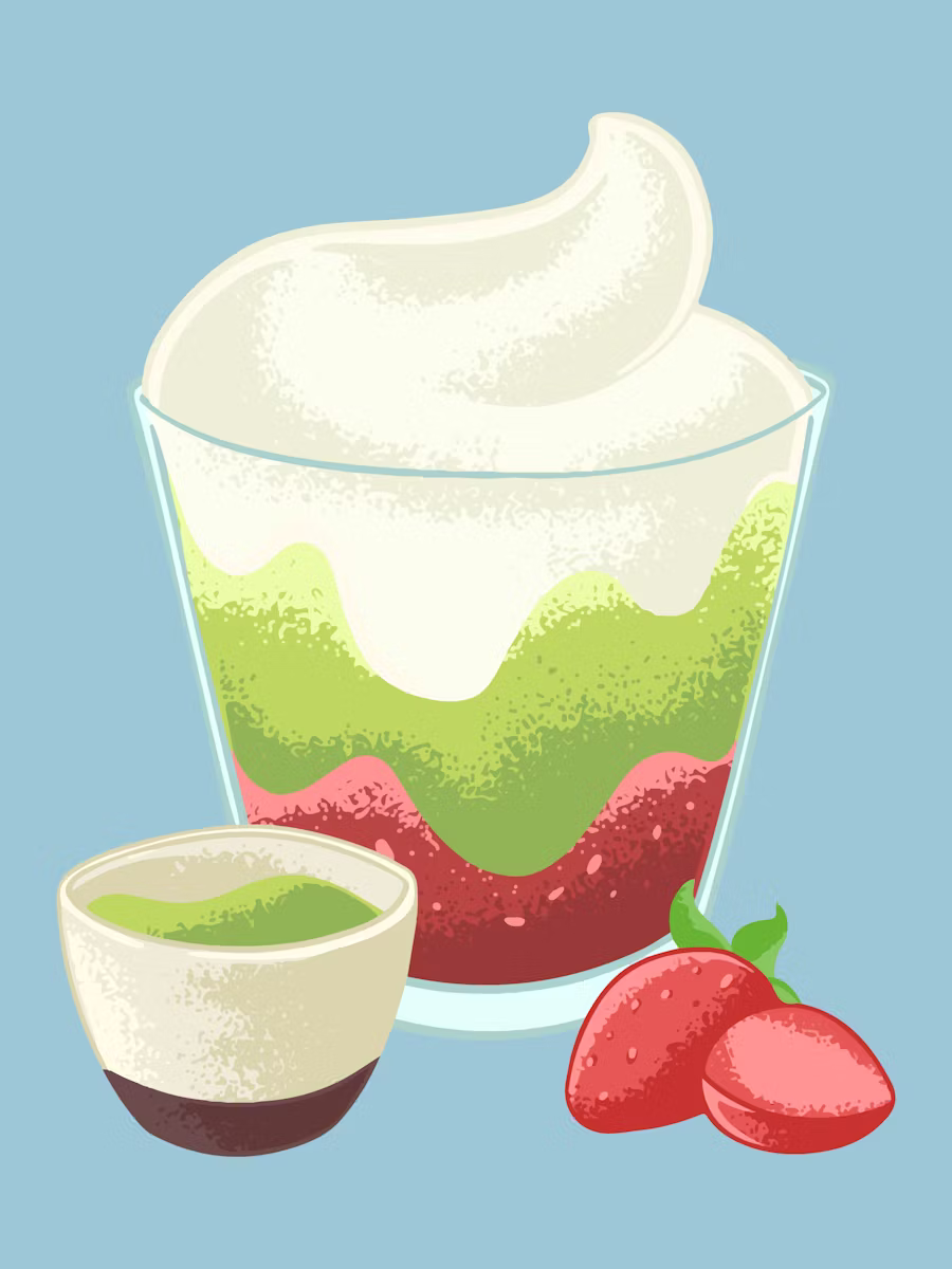 上から、緑色ホイップ(ピスタチオ味)、ストロベリーソース、スポンジ、生クリームが重なっています。