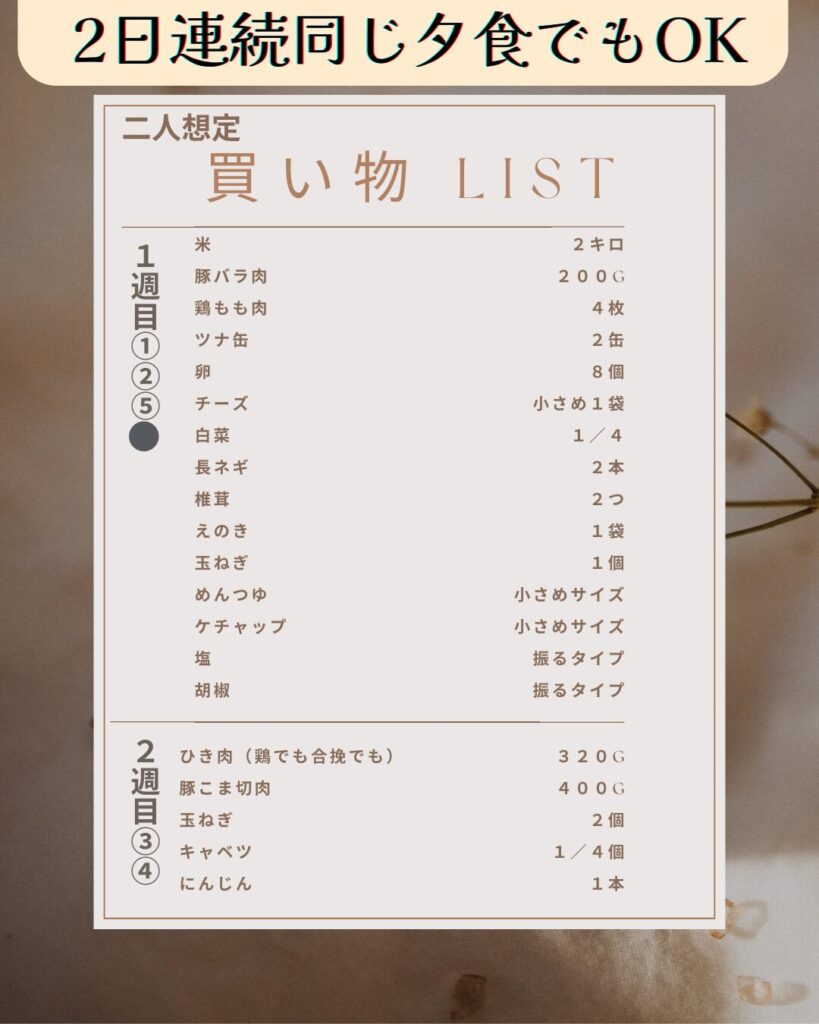 買い物の頻度や2週間の献立プランを考えてみてください。